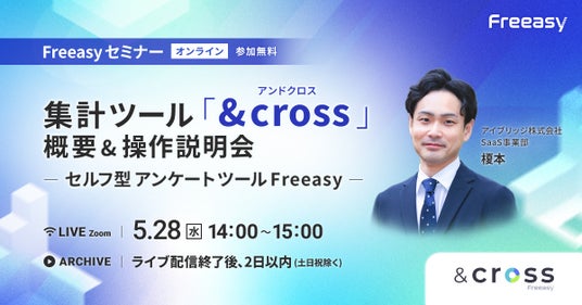 全国1,300万人の調査モニターへ、500円からネットリサーチが実施できる、セルフ型アンケートツール“Freeasy(フリージー)”を展開するアイブリッジ株式会社(本社:大阪市福島区、代表取締役社長:荒川和也)は、『集計ツール「&cross」の概要&操作説明会(セルフ型アンケートツールFreeasy)』を2025年5月28日(水)14時から開催いたします。