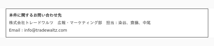 関連プレスリリース:https://www.tradewaltz.com/news/6170/ , https://www.tradewaltz.com/news/6225/ , https://www.tradewaltz.com/news/6257/ , https://www.tradewaltz.com/news/6278/ , https://www.tradewaltz.com/news/6523/