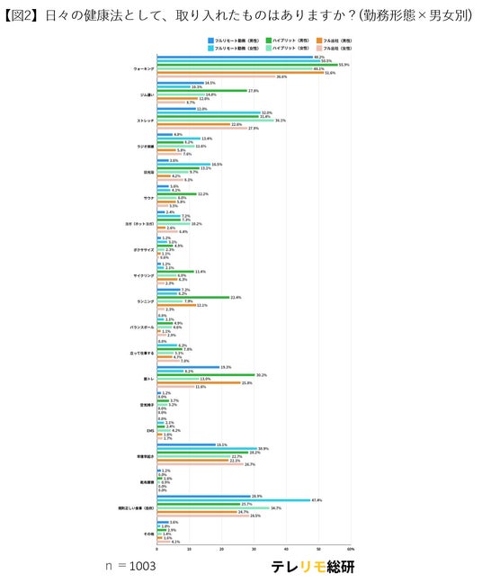 男性は「ウォーキング」や「ストレッチ」、「ジム通い」「筋トレ」など、身体を動かす健康法を幅広く実践。勤務先と自宅、両方を行き来するメリハリが、運動の機会を生んでいるようです。