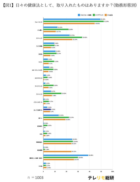 たとえばフルリモート勤務者の多くが、日々の生活の中に運動習慣を取り入れていることがわかります。
