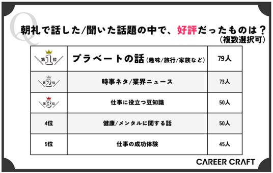 “新しい働き方を提案するメディア” キャリアクラフト では、職場の朝礼/スピーチ事情を徹底調査し、朝礼で好評だった話題についても聞くことができました。