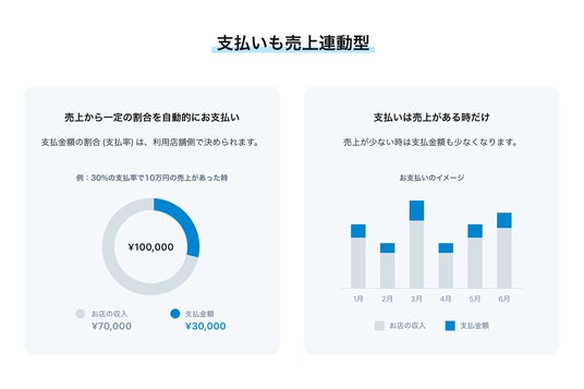 お支払いは、将来の売上から一定率を自動で差し引く形式です。売上が多い日は多めに、少ない日は少なめにお支払いいただくため、毎月固定支出に追われる心配がなく、キャッシュフローを圧迫しません。