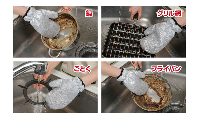 お掃除がめんどうな鍋やグリル網、ごとくやフライパンも水をかけてこすり洗いするだけで焦げや汚れが少ない力で落とせます。しっかり焦げや汚れをこすり取りお掃除もお手入れも簡単です!
