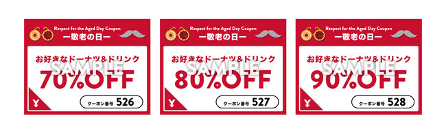 子供や若者に好まれるスイーツというイメージが強いドーナツは、ふわっと柔らかく、優しい甘さが口の中に広がるおいしさで、世代を問わず楽しまれています。今回は「敬老の日」に合わせ、年代別クーポンをご用意しました。“Thank you”の想いを込めて、本体価格3,900円(税込みテイクアウト4,212円/イートイン4,290円)までのお会計でご利用いただける、「70代=70%OFF」、「80代=80%OFF」、「90歳以上=90%OFF」の3パターンとなっています。
