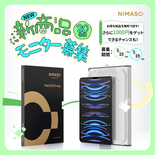 NIMASOでは、お客様からお寄せいただくお声に常に耳を傾け、お客様によりご満足いただけるクオリティの高い製品とサービスを提供することを目指しております。今回の新商品「NIMASOバリ楽BOX iPadガラスフィルム」の良さをより多くのお客様にお伝えできるよう、モニターキャンペーンを開催することにいたしました。