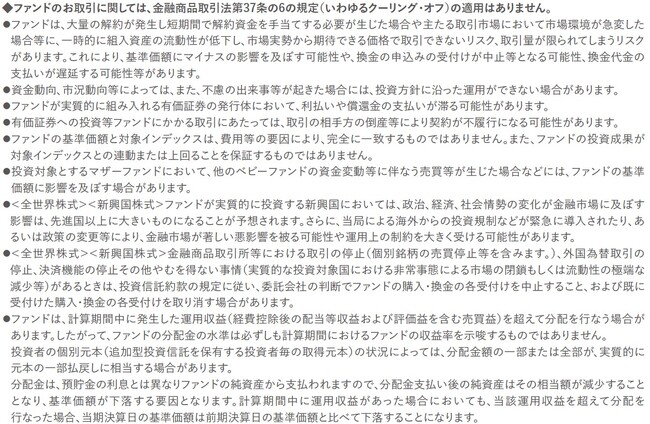 したがって、投資家の皆様の投資元金は保証されているものではなく、基準価額の下落により、損失が生じることがあります。なお、投資信託は預貯金と異なります。