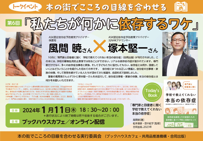 著者の風間暁さんとゲストに塚本堅一さんをお迎えして、依存症当事者・家族の体験、本当の依存症とは何かをお話しいただきます。