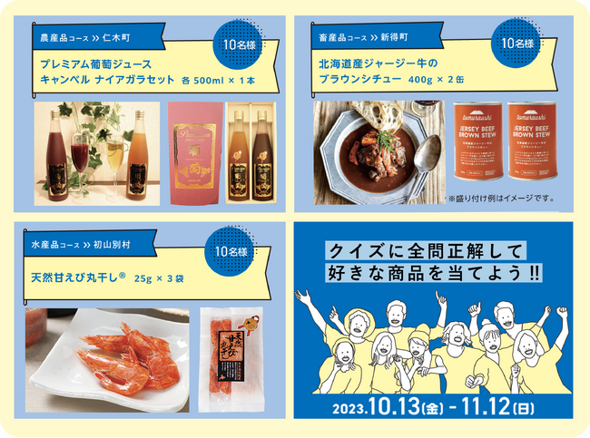 この度、「道ファン子」拡大を図るとともに、北海道ファンの思いをつなぐため、抽選で合計30名様に道内市町村のふるさと納税返礼品になっている逸品が当たるクイズキャンペーンを実施します。