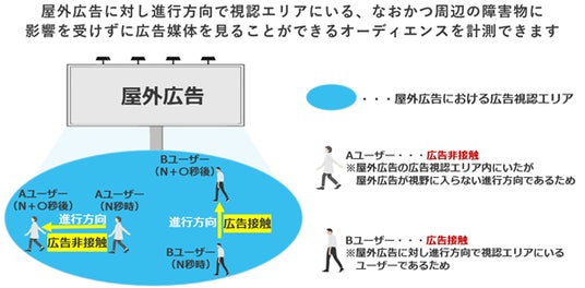 本特許技術は、当社のサービス「Geo-Research(ジオリサーチ)」と統合することにより、屋外広告の視認可能なオーディエンス(OTC: Opportunity To Contact)のみならず、実際に広告を視認した可能性の高いオーディエンス(VAC: Viewed Advertising Contact)までも高精度で測定することができます。