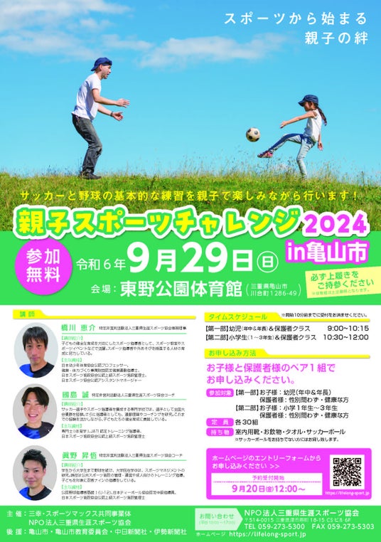 特定非営利活動法人三重県生涯スポーツ協会(三重県津市、理事長 竹田昌平)は、亀山市の東野公園体育館におきまして「親子スポーツチャレンジ2024in亀山市」を開催します。