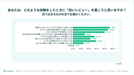高評価レビューの動機として、「期待以上のサービス・サプライズ」(46.7%)、「仕上がり・料理・商品の質」(44.3%)、「スタッフの対応」(40.0%)が上位3項目となった。一方、「クーポンや特典」(29.3%)や「応援したい気持ち」(27.3%)は二次的な動機にとどまり、「個別の配慮」(15.0%)や「スタッフからの依頼」(13.3%)の割合は相対的に低かった。