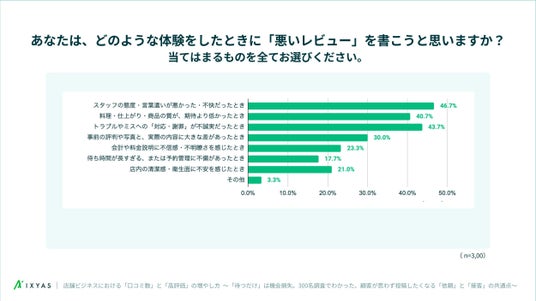 低評価レビューの動機は、「スタッフの態度・言葉遣い」(46.7%)、「トラブルやミスへの対応・謝罪が不誠実」(43.7%)、「料理・仕上がり・商品の質が期待より低かった」(40.7%)が上位3項目となった。