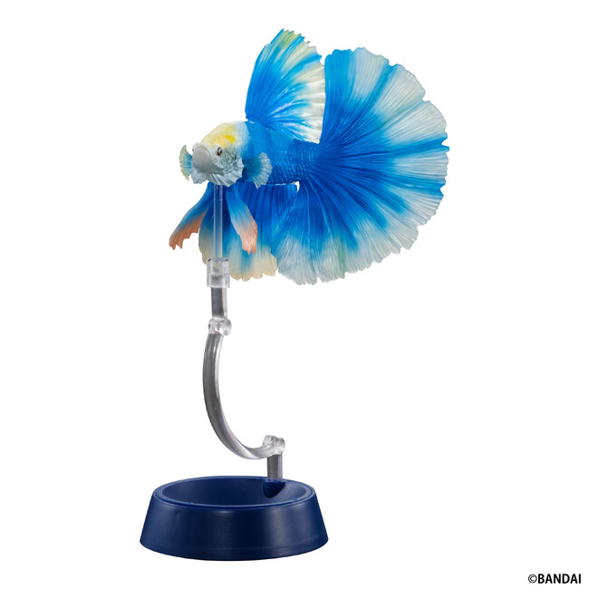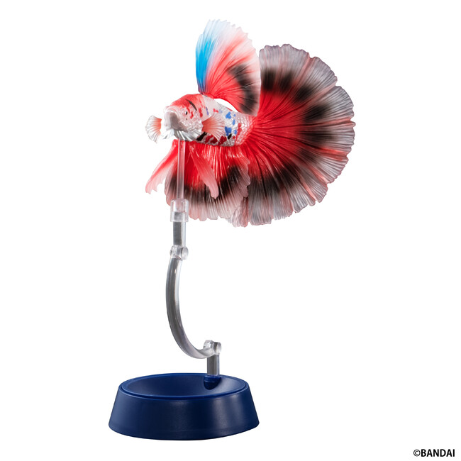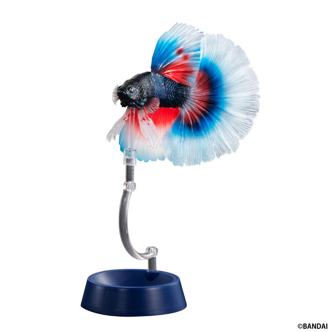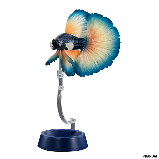 本商品は、アドバンスシリーズ初の魚類可動フィギュアとなります。第一弾は、大きくきれいなヒレを使い優雅に泳ぐ「ベタ」を、全長約130mm、8箇所可動にて再現しました。「ベタ」の華麗なヒレの形状と動きを再現するために、ヒレ部分のみで2種類の固さのポリ塩化ビニールとポリカーボネイトを使い分け、しなやかに泳いでいる姿を再現しています。また、胸びれと腹びれ部分は根本をボールジョイントにすることで、自由に動かすことを可能にしました。カラーバリエーションが非常に豊富な品種の「ベタ」を全4種のカラフルな模様でラインナップしています。カプセルを組み替えることでディスプレイスタンドとして使用できる仕様になっているので、ぜひ机や棚に飾り、驚きのクオリティーをお楽しみください。