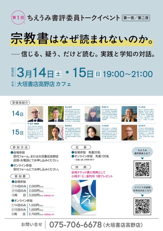 株式会社佼成出版社(所在地:東京都杉並区、代表取締役:中沢純一)が運営する「ちえうみ」では、第1回 ちえうみ書評委員トークイベントを批評誌『羅(うすもの)』を発行する株式会社大垣書店(本社:京都市北区、代表取締役社長:大垣全央)との共催により、大垣書店・高野店で開催します。本イベントはオンライン配信も実施します。