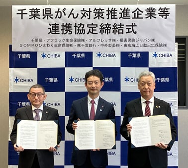 損害保険ジャパン株式会社(代表取締役社長:石川 耕治、以下「損保ジャパン」)およびSOMPOひまわり生命株式会社(代表取締役社長:久米康樹、以下「SOMPOひまわり生命」)は、千葉県が目指す「がん」にうち克つ社会の実現に向け、千葉県(知事:熊谷 俊人)と『千葉県がん対策推進企業等連携協定』を 3月12日に締結したことをお知らせします。
