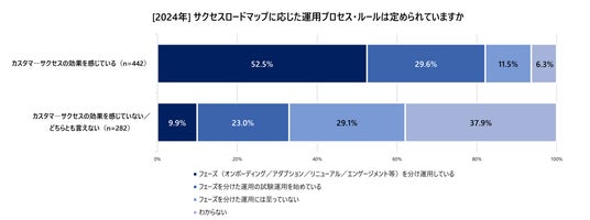 カスタマーサクセスの効果を感じている層では、52.5%の企業がオンボーディングからエンゲージメントまでのフェーズを分けた運用プロセス・ルールを定めています。これは、顧客のライフサイクルに合わせた明確なプロセスを設けることで、顧客対応が効果的に行われ、それがカスタマーサクセスの成果に直結していることを示しています。また、29.6%の企業が試験的に運用を開始しており、カスタマーサクセスの重要性を認識しながらも、さらなる成果を期待している企業が少なくないと考えられます。