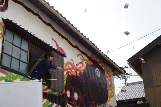 節分で各家庭から追い出された鬼たちからお詫びと感謝の気持ちを込めて、「ご縁投げ」。お菓子や賞品を妖怪美術館の窓から投げてふるまいます。