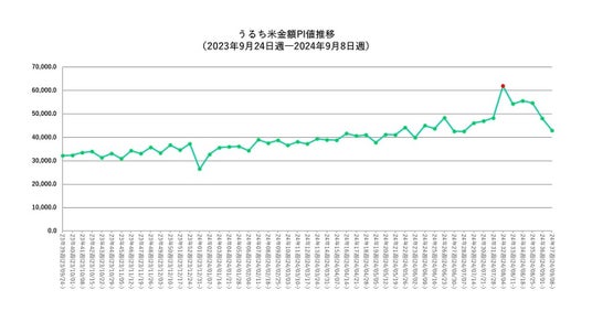 コシヒカリやあきたこまちなど、一般的なコメとして流通している「うるち米」の金額PI値(レジを通過したお客様1,000人あたりの販売金額指数)推移を分析しました。2024年1月から緩やかに増加傾向にあり、6月頃から増加度合いが大きくなっています。8月4日週に金額PI値が跳ねており、これには台風発生や南海トラフ地震臨時情報による消費者の購買状況が影響していると見受けられます。翌週からは徐々に落ち着き始めています。