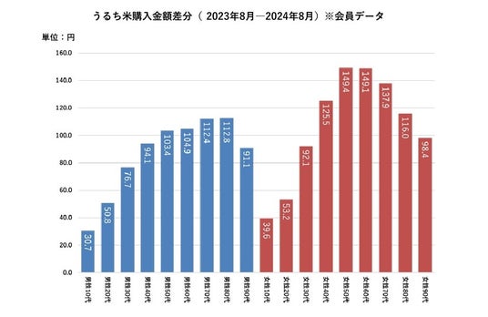 2023年8月と2024年8月のうるち米の平均購入金額の差分を比較してみると、男女ともに全世代において2024年の購入金額はプラスとなっています。特に女性50-60代では増加幅が大きいことが分かります。