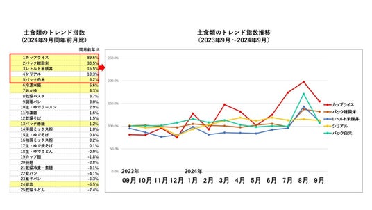 2024年の夏は、コメが店頭において品薄となりました。その時期に、コメの代替商品として何が購入されたかを調査しました。主食となりうる商品を25点ピックアップし、トレンド指数(時系列の売上トレンドの傾向を把握する指標・22年9月~23年8月の平均月間金額PI値が基準)を分析しました。2024年9月の同月前年比(2023年9月)を比較すると、「カップライス」「パックご飯」「おかゆ」などのコメ関連商品が、各種の麺類や粉もの、パン類よりも大幅に伸びていることが分かります。また、主食類のトレンド指数の同月前年比上位5品目の指数推移をみてみると「カップライス」や「パック白米」の2024年7月から8月の上昇幅が大きく、コメの品薄に伴った代替商品として購入されていた様子がうかがえます。