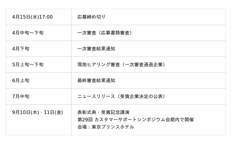 受賞企業、団体、機関につきましては表彰式典を、2026年9月10日(木)~11日(金)開催の「第29回 カスタマーサポートシンポジウム」会期内で執り行います。
