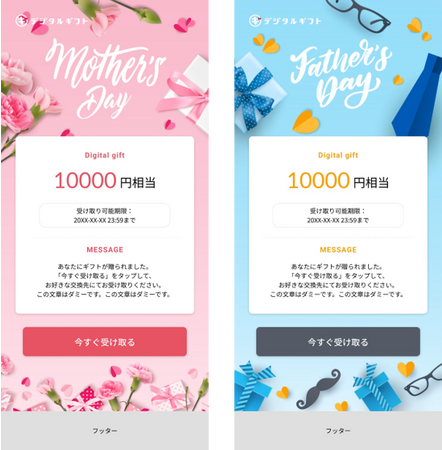 株式会社デジタルフィンテック(代表取締役社長:菊池 誠晃、本社:東京都渋谷区)が運営する 「デジタルギフト(R)」に、母の日、父の日に合わせたキャンペーンデザインが登場しました。