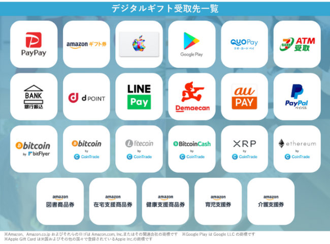 当社は、金券(商品券・図書券等)を直接購入するよりも、多くの金券に対応した当社が選択される基盤を構築、マーケティングツールとして、より使い勝手の良いサービスへ強化しております。加えて、ギフトを発行するごとに手数料が発生してしまうと結果として多額の手数料が発生してしまうことから、よりギフトを発行する会社様が利用しやすくなるよう、月々の利用料を定額化するサービスへの転換(サブスク収益への転換)を進めております。2.受取先の拡充従来のギフト券はもちろん、キャッシュレス化・コロナ禍によって著しく進むDX化に伴う未来のギフト・マネーサービスにも随時対応、約10兆円の国内ギフト市場を網羅していきます。<デジタルギフト受取先一覧>