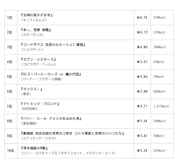 (表内左から、順位、作品タイトル(配給)、★スコア、Mark!数)