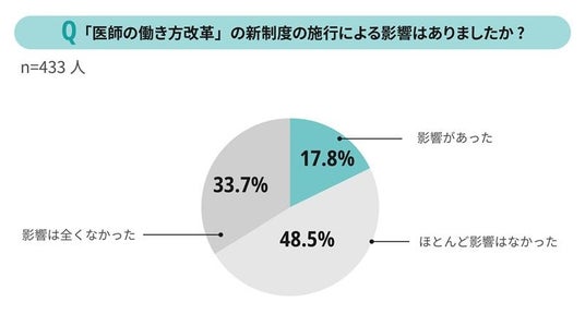 調査結果によると、制度の影響を「感じている」開業医は約2割でした。「医師の働き方改革による影響を感じている」と回答した開業医は全体の17.8%。多くの開業医が「影響はない」との回答があったものの、特に勤務医を雇用しているクリニックでは、労働時間の管理や人件費の増加、診療体制の見直しなど、制度への対応が求められていることが浮き彫りになりました。