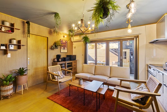 「マイグレA5(エーファイブ)」は、北欧デザインと豊かな緑をコンセプトに、自然素材の温もりと緑あふれる空間が調和した新しいスタイルの一棟貸別荘です。内装には北欧デザインを採用し、リブパネル調の壁紙や木目を活かしたインテリアが、温かみがありつつも洗練された雰囲気を醸成。天井から優雅に垂れ下がる植物が非日常の世界を彩り、まるで森の中の北欧カフェにいるような癒しの空間を演出しています。