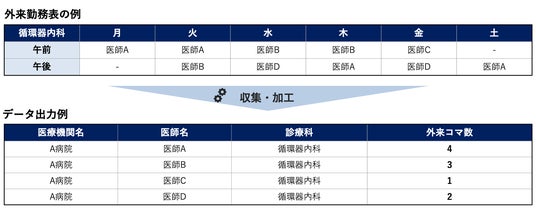 そこで当社では医師情報の中でも構造が複雑で収集が困難とされてきた「外来コマ数データセット」の開発に挑み、独自のアルゴリズムと運用手法を組み合わせて、外来コマ数データの精緻かつ効率的な収集・整備を実現。あわせて、定期的な更新体制も構築し、常に最新の診療実態に基づいた情報提供を可能にしています。
