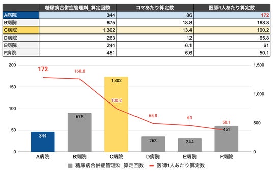- C病院:糖尿病合併症管理料の算定回数は比較病院中では最も多い