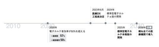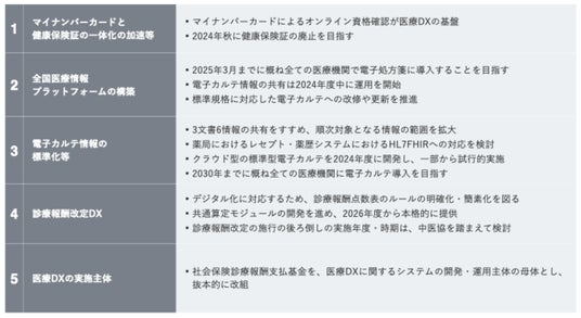日本医療のデジタル化は、新型コロナウイルス感染症への対応では「デジタル敗戦」と評されました。こういったこともひとつの契機となり、政府は医療DXを推進すべく、総理をトップとする医療DX推進本部を設置、2023年6月に策定された「医療DXの推進に関する工程表」では具体的な政策として以下の5項目が示されました。