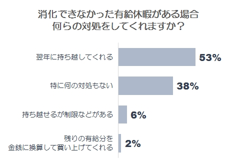 また、「職場は消化できなかった有給休暇がある場合に何らの対処をしてくれますか?」と聞いてみたところ、「翌年に持ち越してくれる」が53%、「特に何の対処もない」が38%、「残りの有給分を金銭に換算して買い上げてくれる」に関してはわずか2%という結果になりました。
