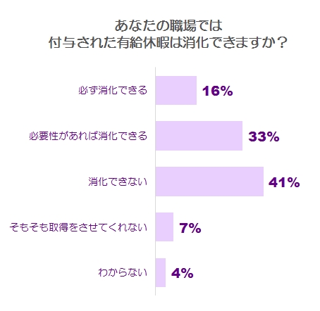 有効回答者全員に対し「あなたの職場では付与された有給休暇は消化できますか?」と伺ってみたところ、「必ず消化できる」と回答したのはわずか16%。「必要性があれば消化できる」が33%、「消化できない」が41%と、半数近くの回答者は消化が難しい現状に置かれていることがわかりました。