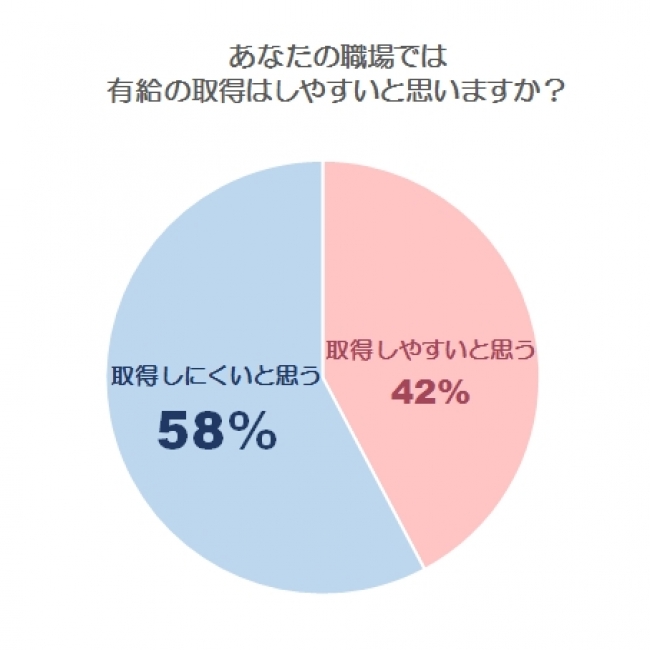 上のグラフのとおり、有給休暇が「取得しやすいと思う」という回答が42%だったのに対し、「取得しにくいと思う」という回答が58%と約6割を占める結果となりました。