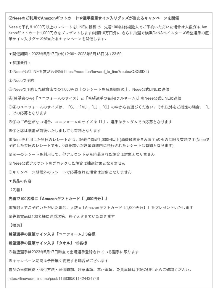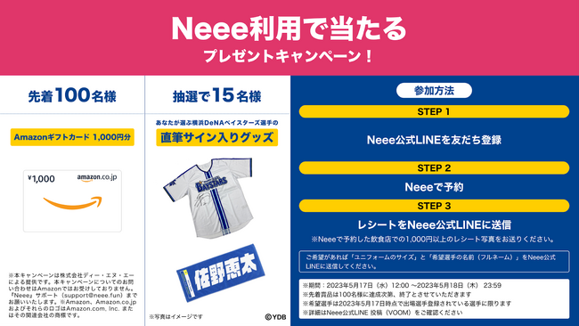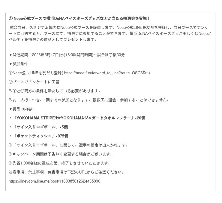 「DeNA Neeeナイター」では、Neee公式のブースを出展し、横浜DeNAベイスターズグッズが当たる抽選会を実施するほか、Neeeのご利用でAmazonギフトカードや選手直筆サイン入りグッズが当たるキャンペーンを開催します。今回の冠試合の開催を通じて、多くの野球ファン、スポーツファンの皆さまとともに、横浜の街を一緒に盛り上げる機会にしたいと考えております。皆様のご来場を心よりお待ちしております。