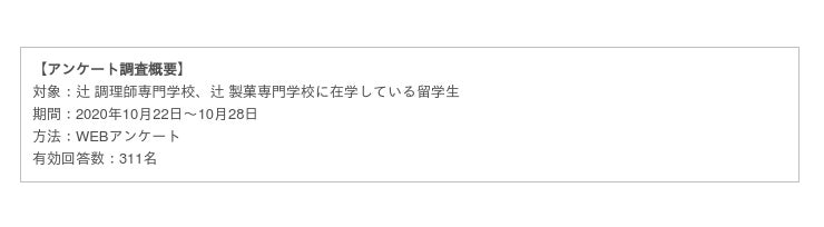 昨年10月、辻調理師専門学校、辻製菓専門学校の留学生を対象にアンケート調査を実施しました。卒業後の進路や日本で料理・菓子を学ぶ目的などについて調査しました。