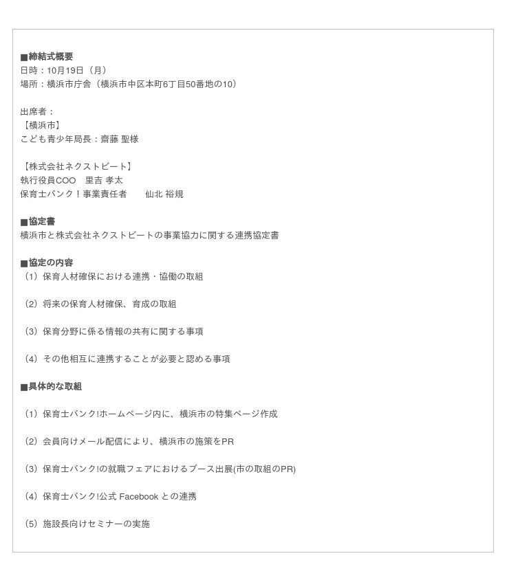 日本最大級の保育士専門の就職・転職支援サービス「保育士バンク!」を運営する株式会社ネクストビートは、横浜市と「保育人材確保における連携・協働の取組に関する協定」を締結いたしました。就職・復職活動中の保育士や市内保育施設に対して、双方の資源やノウハウを活かした支援を行うことで、横浜市全体の保育人材の確保・定着化や質の向上をより効果的に進めていきます。