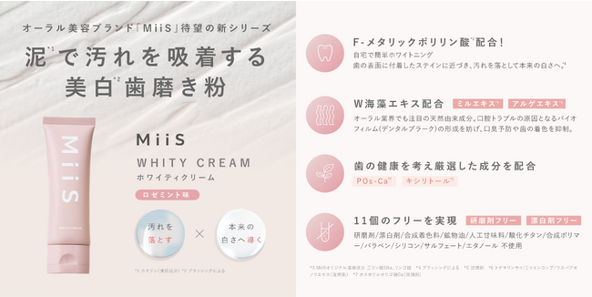 コミュニティデータプラットフォーム事業を軸にコミュニティブランド、メディア、マーケティングソリューションを提供する株式会社ライスカレー(本社:東京都渋谷区、代表取締役:大久保 遼)が展開するオーラル美容ブランド「MiiS(ミーズ)」は、ホワイトニング×虫歯・口臭予防*1を叶える、クレイ*2ペーストの新感覚歯磨き粉「ホワイティクリーム」と、プラチナナノ粒子配合のホワイトニング専用歯ブラシ「プラチナホワイトニング歯ブラシ」を発売いたします。