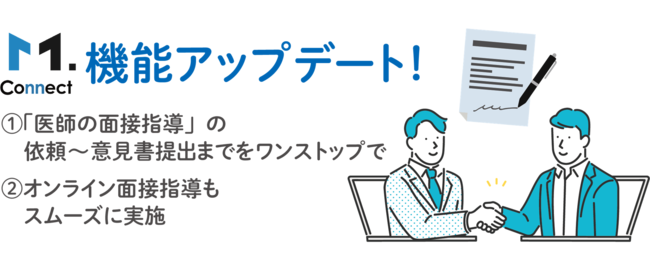 今回の機能アップデートにより、医師の面接指導を実施するにあたり、企業からの新規依頼、面接資料の登録、医師の意見書の登録、共有までの一連の活動を、全て『M Connect』のセキュアな環境の中、ワンストップで実施できるようになりました。