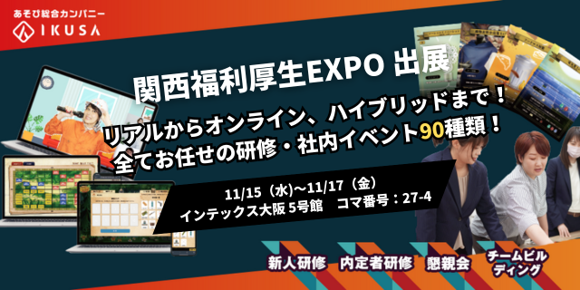 チームビルディング研修や社内イベントを企画運営する株式会社IKUSA(本社:東京都豊島区、代表取締役:赤坂大樹)は、2023年11月15日(水)~17日(金)にインテックス大阪で開催される展示会「第7回 関西福利厚生EXPO」に出展します。