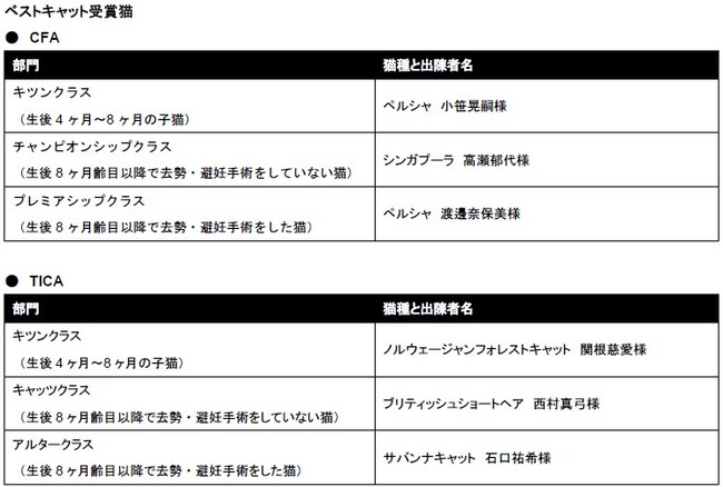 キャットショーは猫の保全と普及を目的に、猫種ごとに定められた審査基準によって、スタンダード(猫種ごとの本来の骨格や毛色など)により近い容姿を兼ね備えた猫を評価するものです。ジャパンキャットショーでは、歴史ある2大血統書登録団体であるCFA(The Cat Fanciers’Association, Inc.)、TICA(The International Cat Association)によるキャットショーを一度に楽しめ、出陳頭数(出場する猫の数)はCFAには24種121頭、TICAには24種93頭、合計25種214頭と、日本で開催されるキャットショーとしては近年最大規模となりました。今回のショーでは、CFA、TICAの計6部門で高得点を得た計6頭の猫が栄えあるベストキャットとして選出されました。