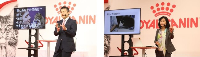 会場ではキャットショーに加え、ペットオーナー向けのセミナーも開催されました。服部幸先生(東京猫医療センター院長)による「ねこを幸せにするための“動物病院活用術”」では、動物病院は病気の時だけでなく、健康診断、食事の相談、ダイエット、爪切りなど猫に関する悩みはなんでも相談できる場所と紹介し、実際にペットオーナーが撮影した動画なども交え受診する際のポイントや、かかりつけ動物病院の重要性について解説しました。また入交眞巳先生(東京農工大学特任講師)による「ねこを幸せにするための3ポイント」では、猫と人の歴史や猫の習性、猫の気持ちの表し方などを紹介した上で、猫を幸せにするために重要な「寝床」「あそび」「トイレ」の3つのポイントについて解説しました。会場のメインステージで2回ずつ行われた両先生のセミナーには、毎回50名を超える方が真剣な眼差しで聴講したほか、オンラインでも同時配信し、愛猫の真の健康を育むための知識と行動をより多くのペットオーナーに学んでいただきました。