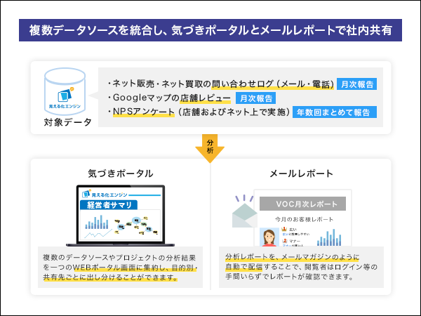 電話・メール等で寄せられる問い合わせログ、店舗レビュー、NPS(R)(※2)アンケートを中心に、あらゆる「お客様の声」を集約し、部門横断で扱うことで分析の質を向上し、メールレポートやWEBポータルで社内共有するほか、声をもとにした改善提案につなげています。