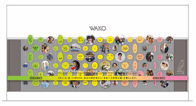 3月11日(金)14時46分を迎えると、1分間の黙とうの目安となる11回と2回の時打ちの鐘の後、音楽家、アーティスト・蓮沼執太(はすぬま・しゅうた)さんが、SNSで世界各地の鐘の音を募り、それらを基に新たに制作した「未来への希望の鐘」(作曲:蓮沼執太)が鳴り響きます。その後、ウインドウ周辺にはナット・キング・コールが歌う「SMILE(スマイル)」が流れます。