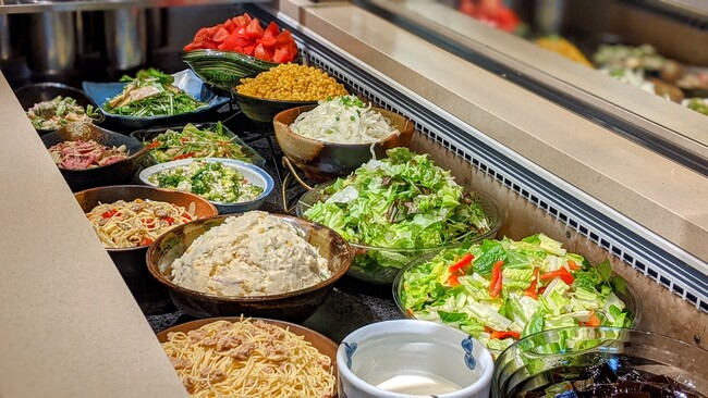 「ロメインレタス」「トマト」「やわらかキャベツ」「パリパリレタス」「わかめ」「つぶつぶコーン」「オニオンスライス」「たまごマカロニサラダ」「フルーツ盛り合わせ」「えびせん」※ディナー限定「生八ツ橋&粒あん」「ふわふわティラミス」
