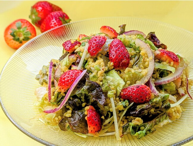 三つ葉とごま油の香りがたまらない「ごま香るあさりと三つ葉の海苔豆富」は、海苔ソースの風味とあさりの旨みを楽しめる豆腐のサラダです。また、毎年大好評の筍をたっぷり使った「春を告げる若竹サラダ」は、旬のわかめを合わせ、りんご酢が効いたオニオンドレッシングで和え、さっぱり爽やかに仕上げました。他にも、プチッとした食感のクスクスを使った「苺のサラダ カレー風味のクスクス和え」や、新玉ねぎのやさしい甘さの「新玉ねぎとルッコラの黒ごまパスタ」、お口直しの「あまおうの苺ゼリー」と、春の美味しさを感じていただけるメニューです。
