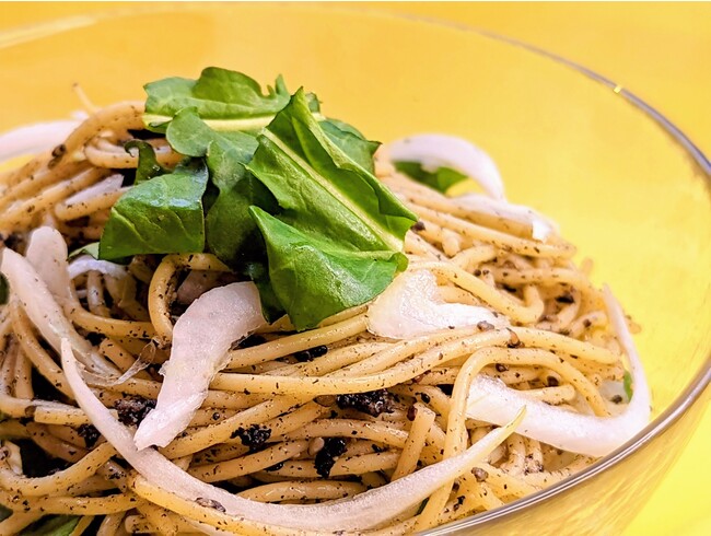 ▲「新玉ねぎとルッコラの黒ごまパスタ」