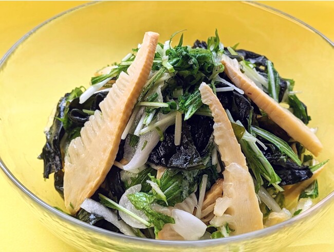 旬の筍とわかめの煮物、若竹煮をイメージしました。出汁がきいた筍のシャキシャキとした食感、わかめのコリコリ食感、新玉ねぎと水菜の軽い食感など、色々な食感が楽しめます。りんご酢が効いたオニオンドレッシングで、さっぱり爽やかに仕上げました。